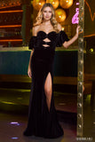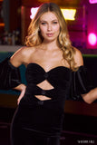 Strapless velvet gown with key holes, detachable ballon sleeves and high slit.