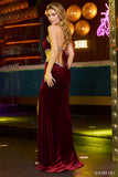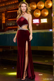 Velvet gown with halter neckline, rhinestone embellishments, side cuts, high skirt slit, and open back.
