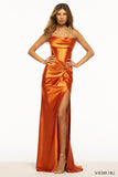 Strapless silky stretched satin gown with corset top, ruched waistline, and skirt slit.