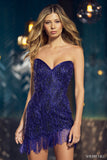 Strapless fully beaded cocktail dress with fringe at the hemline.