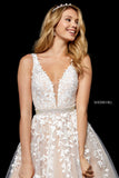 Lace deep V bodice with tulle ball gown skirt and beaded belt.