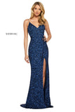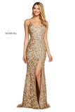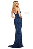 Sequin gown with V neckline and back, with tassel tie belt and skirt slit.