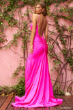 Fitted jersey gown with V-Neckline, low open back and skirt slit.