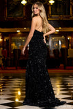 One shoulder fitted sequin velvet gown with a high slit.