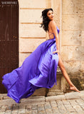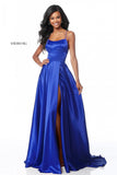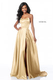 Satin A-line gown with strappy lace up back and high skirt slit.