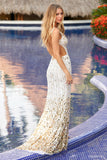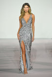 Sherri Hill 54912 Sequins gown with deep V neckline, open back, and high slit.