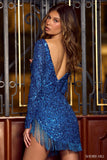 Long fringe sleeved sequin cocktail dress with Deep V neckline Illusion and high fringe slit.
