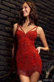 Fully beaded cocktail gown dress with straps across neckline, fringe on hem and open back.