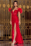 Leaf lace fitted gown with plunging deep V neckline, corset top, feathered sleeves, and slit.