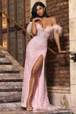 Sequin leaf lace embroidered gown with deep V corset top, feathered sleeves, and slit.