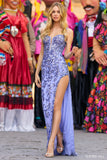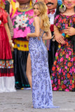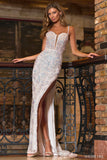 Beaded corset bodice with a deep sheer V-Neckline, high slit and lace up back.