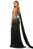 One shoulder scuba dress with hot fix embellishments, side cut out, slit, and cape.