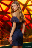 Strapless hot fix cocktail dress with sheer corset bodice.