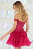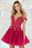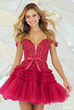 Short tulle dress with tiered ruffle skirt, lace corset bodice with bow, deep V illusion neckline, and off the shoulder sleeves.