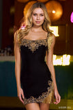 Velvet cocktail dress with gold beaded embellishments, fringe on sleeves and skirt slit.
