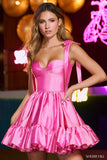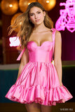 Taffeta cocktail dress with a sweetheart neckline, bow sleeves and ruffle hem.