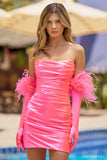 Strapless silky stretched satin cocktail gown with ruched bodice, straight neckline, and detachable long sleeves with ostrich feathers on the top.