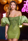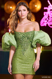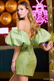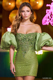 Short beaded cocktail dress with taffeta balloon sleeves.