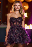 Strapless floral tulle print ball dress with ruffle embellishments and sheer corset bodice.