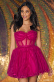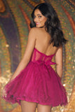 Strapless tulle dress with sheer corset bodice and ruffle embellishments.