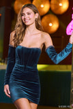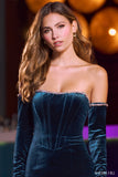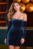 Off the shoulder long sleeve velvet cocktail dress with corset bodice and rhinestones embellishments on the trim.