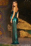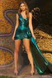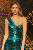 One shoulder stretch ruched metallic cocktail dress with side drape.