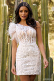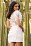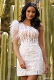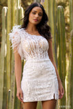 One shoulder feather sequin corset dress.