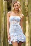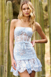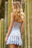 Strapless sequin cocktail dress with sheer corset bodice, satin bow belt and ruffle hem.