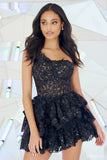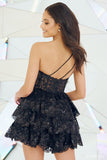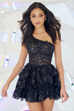 Tulle sequin one shoulder cocktail dress with sheer corset bodice, and ruffled skirt.