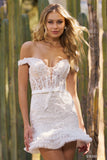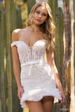 Lace cocktail dress with ruffled hem, lace corset bodice with bow, deep V illusion neckline, and off the shoulder sleeves.