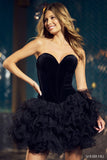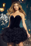 Strapless cocktail dress with velvet corset top and ruffled organza skirt.