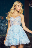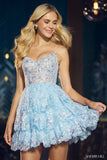 Short sequin tulle dress with sheer corset bodice and ruffle skirt.