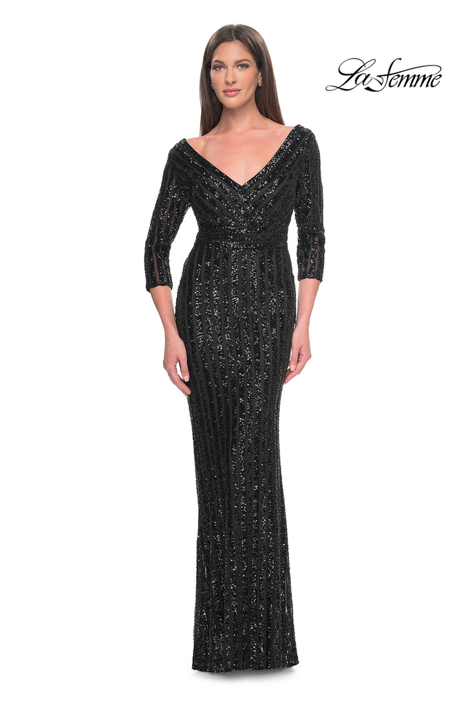 Long evening dress with a unique sequin featuring thick lines. The neckline is V shape and it has three quarter sleeves. Back zipper closure.