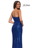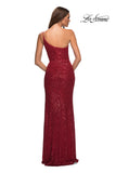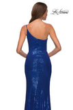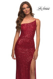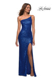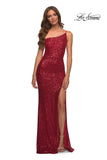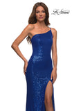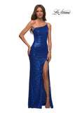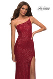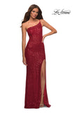 Simple one shoulder stretch sequin gown with slit. Back zipper closure.