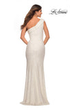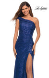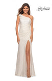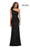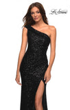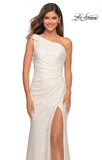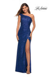 Elegant one shoulder sequin gown with ruching and slit. Back zipper closure.