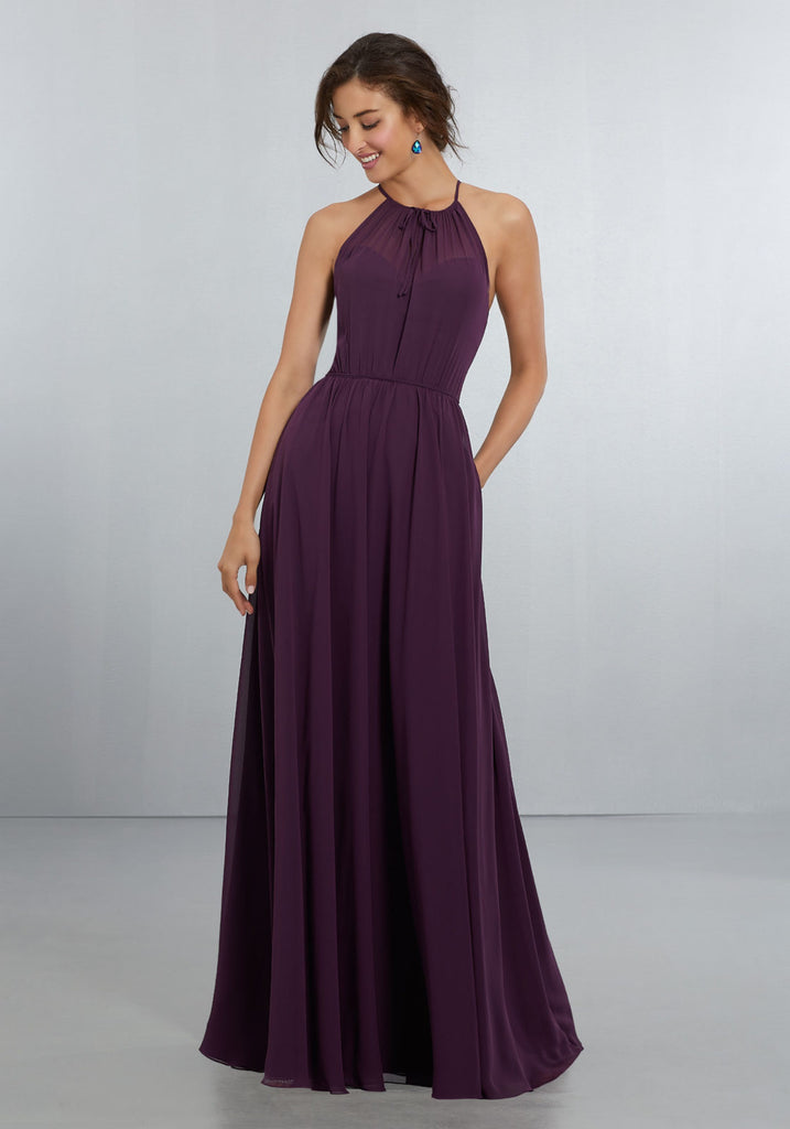 Sophisticated, High Halter Chiffon A-Line Gown with Tie-Front Detail at the Neckline and Crystal Button Back Neckline Detail with Keyhole and Zipper.