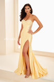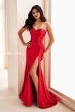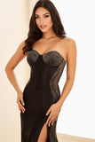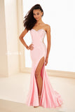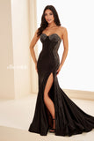 Make a stunning entrance in the Ellie Wilde EW37010, a glamorous mermaid prom dress crafted from stretch knit and adorned with sparkling stone accents. Featuring a flattering sweetheart neckline and a corset bodice with a lace-up back, this strapless gown defines elegance and confidence. The dramatic thigh-high slit and basque waistline enhance your silhouette for a captivating look that turns heads all night. Perfect for prom or any special event where you want to shine.
