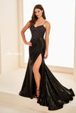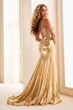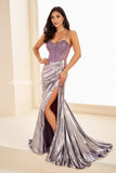 Captivate every room in this stunning mermaid gown that commands attention from the moment you arrive. The strapless corset bodice features intricate beading and stone accents that sparkle under any light, while the metallic lamé skirt shimmers with every movement. A daring thigh-high slit adds allure and elegance, complemented by a sophisticated lace-up back detail. Perfect for proms, galas, and unforgettable evenings where you want to make a lasting impression.