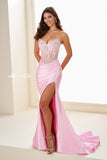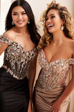 This Ellie Wilde EW37056 gown combines elegance and allure with its off-the-shoulder design and sweetheart neckline. The corset bodice enhances your silhouette, while the Basque waistline and mermaid skirt create a stunning, figure-flattering shape. Crafted from stretch knit adorned with beading, corded lace applique, sequins, and stone accents, it offers both comfort and sparkle. The detachable off-the-shoulder straps and lace-up back add versatility and a perfect fit. Finished with a sleek slit, this long gown is ideal for making a memorable entrance.