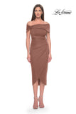 Ruched off the shoulder jersey dress with tulip style skirt. Back zipper closure.
