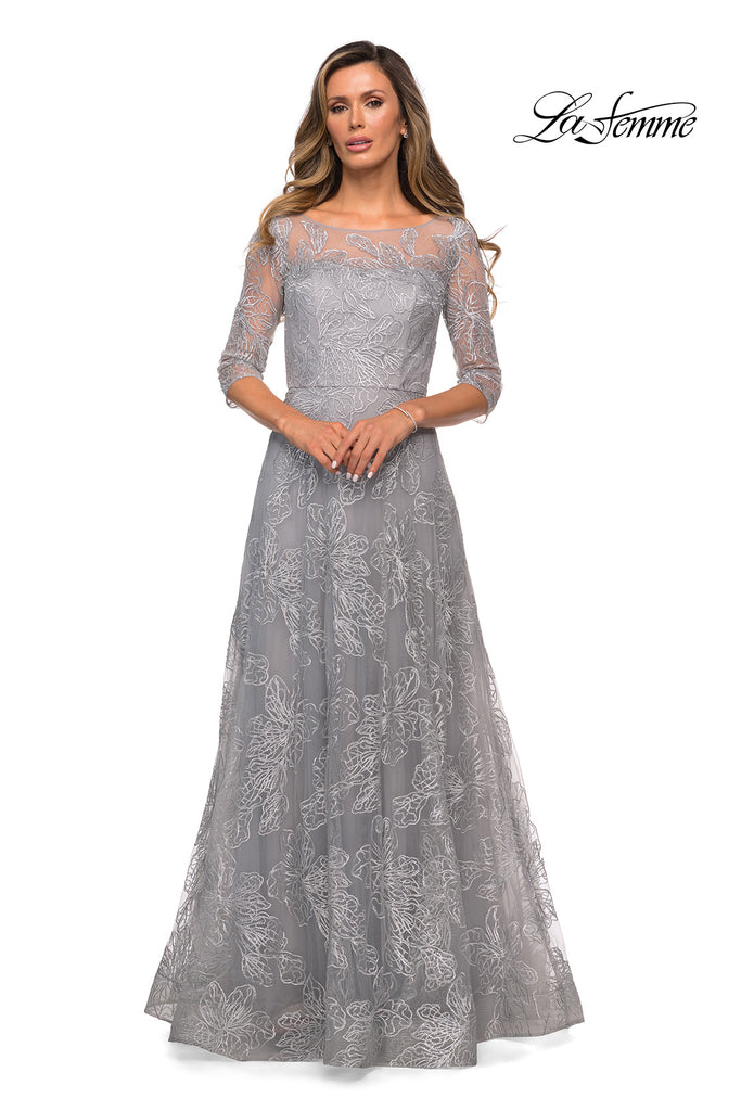 Stunning A-line lace sequin gown featuring three quarter sleeves and a flatter sheer scoop neckline.A beautiful floral design completes this look. Back zipper closure.