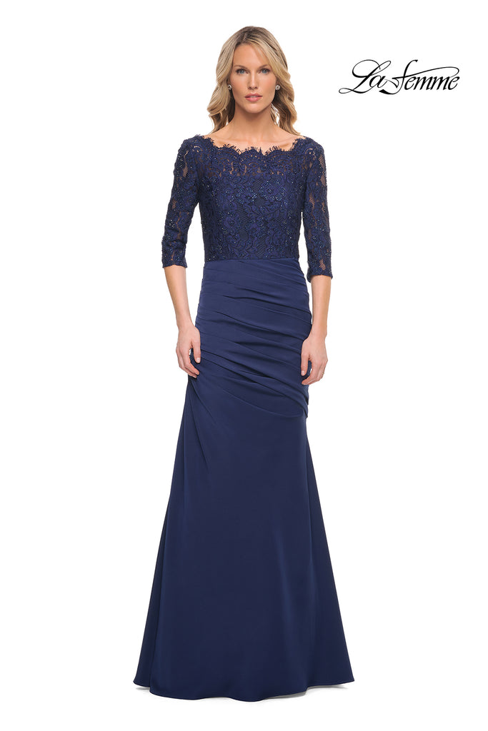 Captivating jersey evening dress with a beautifully beaded lace bodice. The skirt features elegant asymmetrical gathering. Back zipper closure.