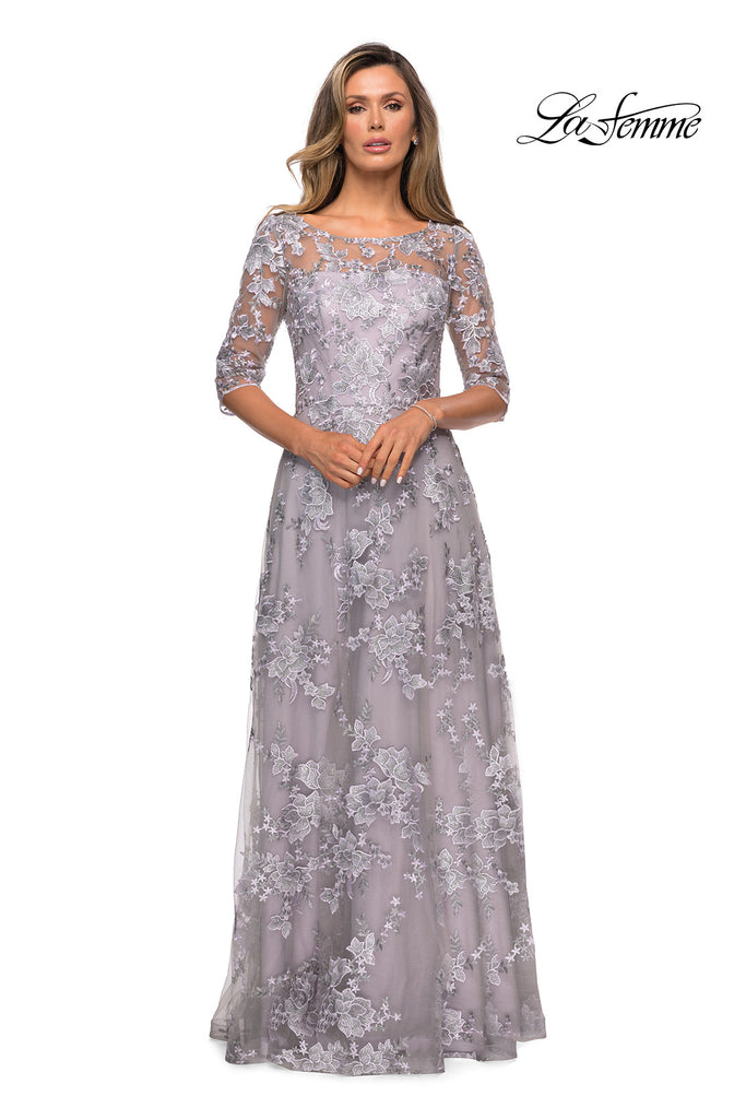 Long three quarter sleeve A-line evening gown with high sheer scoop neckline and intricate floral lace design. Back zipper closure.