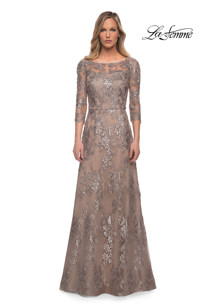 Elegant floor length mother of the bride or groom gown with sheer high neckline. Dress features three quarter sleeves. Back zipper closure.