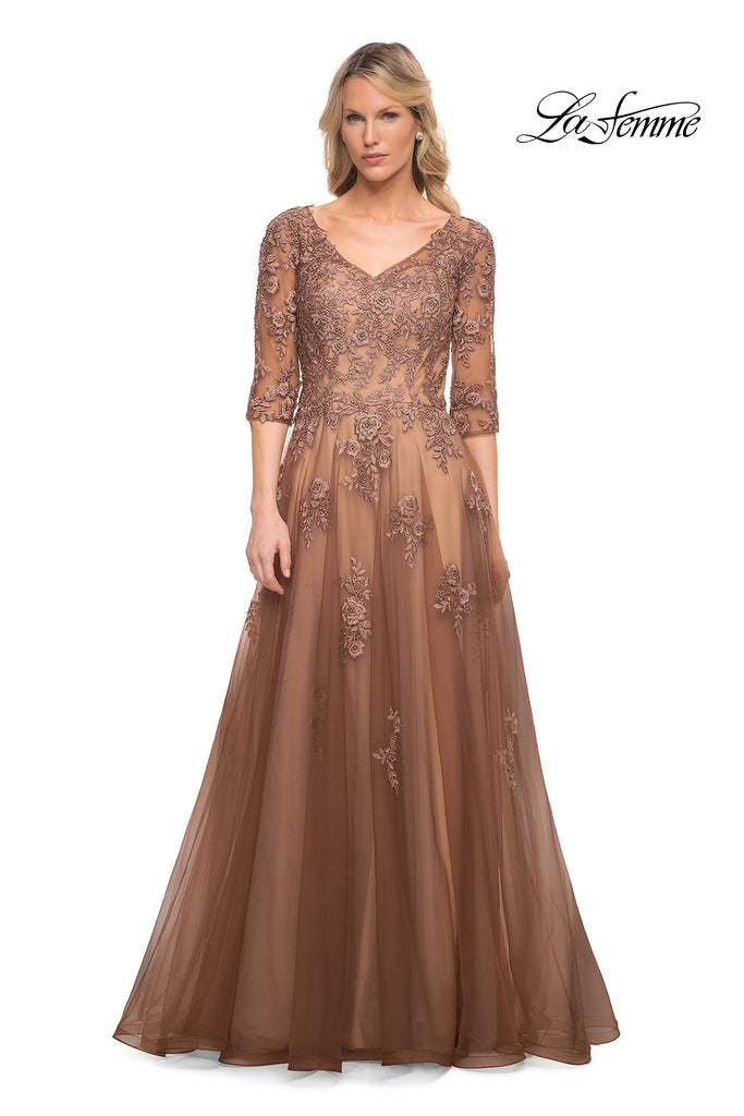 Beautiful floor length A-line gown with full tulle skirt and cascading floral lace detail. Features a heavaily floral embellished bodice and soft V-neckline. Pockets complete this design. Back zipper closure.