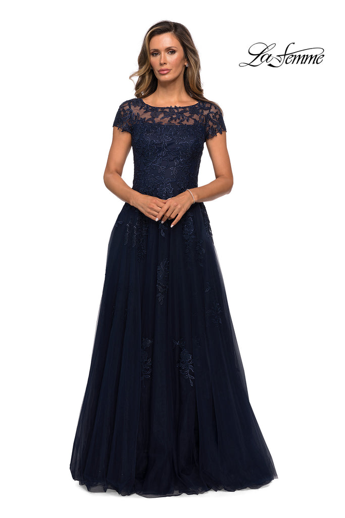 Elegant A-line gown with tulle skirt and intricate floral lace detail. Features a sheer neckline and sheer cap sleeves as well as scattered rhinestone detailing. Back zipper closure.