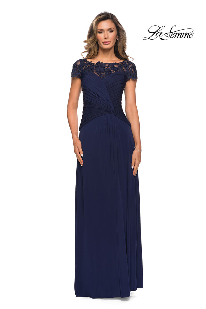 Elegant floor length jersey mother of the bride gown with flattering ruched detail and a sheer floral lace neckline. Short sleeves complete this look. Back zipper closure.