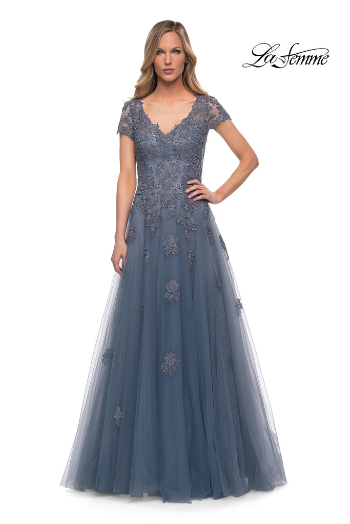 Tulle A-line gown with lace appliques on bodice and cascading down the skirt. V neckline and sheer short sleeves. Back zipper closure.