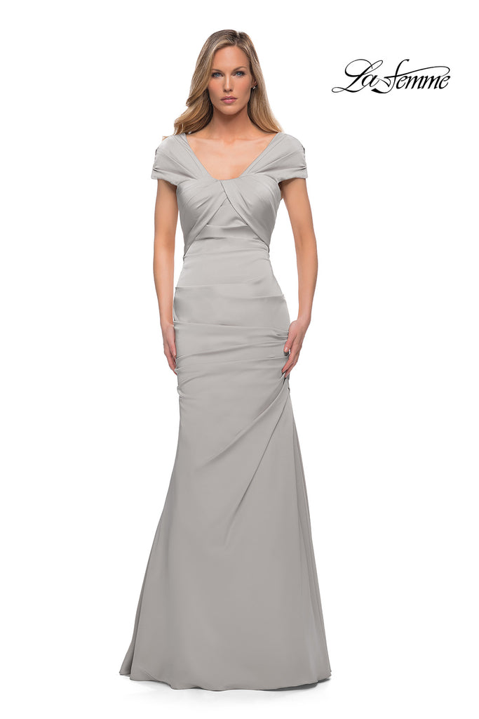Jersey long gown with unique bodice and pleated ruching throughout skirt. Short sleeves and criss-cross front detailing. Back zipper closure.