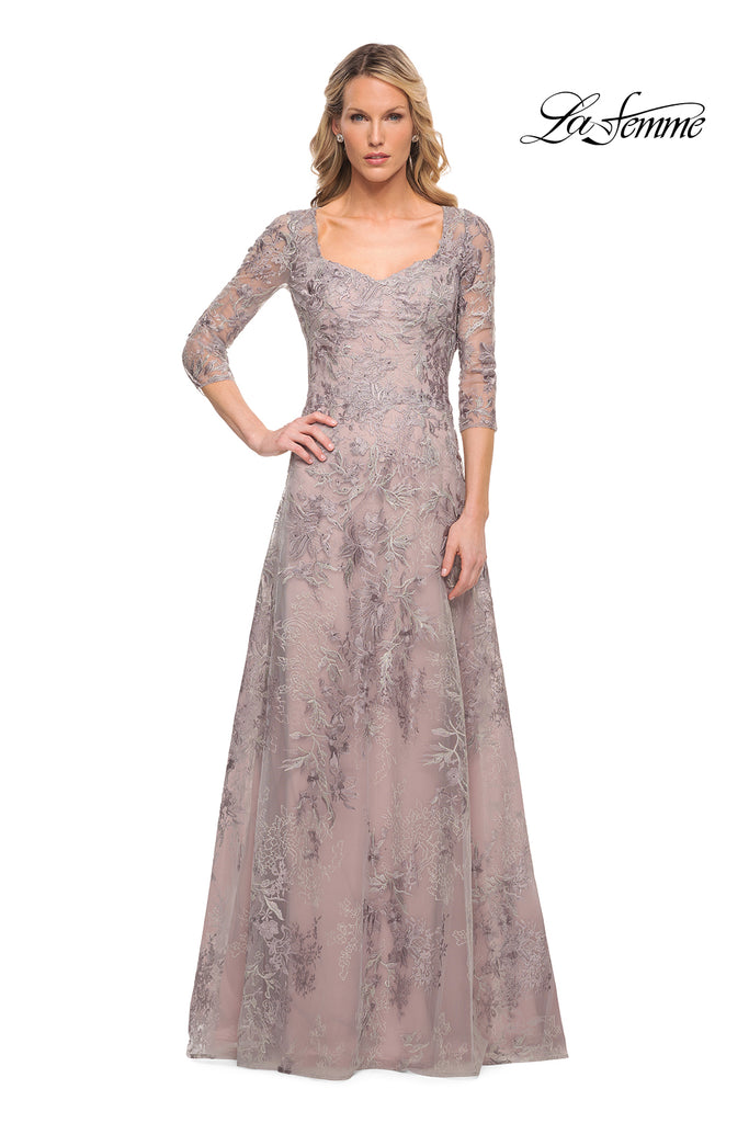 Lace gown with full skirt and illusion three-quarter sleeves. Unique neckline with V middle. Back zipper closure.
